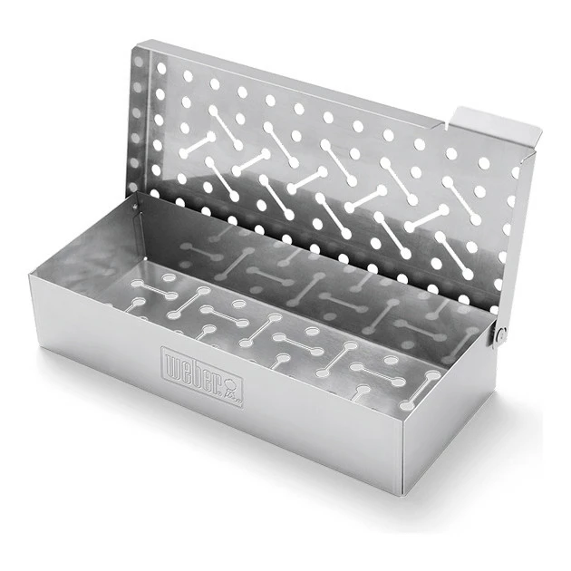 C’est une boite en triangle ou cylindrique, percée de trous qu’on place entre deux déflecteurs du barbecue gaz. On aura mis des copeaux de bois préalablement trempés dans l’eau pendant un minimum de 2 heures pour les imprégner d’eau. La chaleur va faire s’évaporer l’humidité contenue dans les copeaux de fumage, communiquant ainsi l’arôme de l’essence bois choisie aux aliments. Cette forme de fumage convient bien au poulet, au porc, aux poissons, aux légumes.