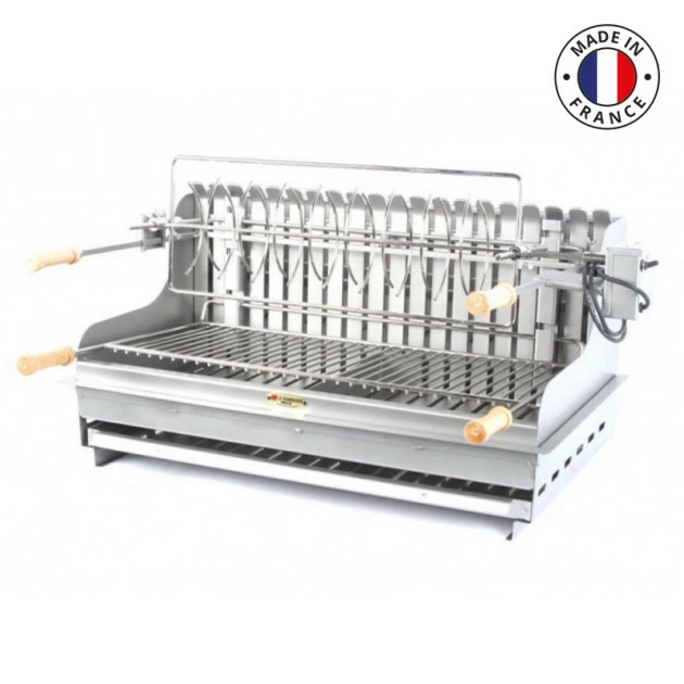 Ce barbecue charbon de bois est fabriquĂ© en France. Il est Ă©quipĂ© d’une double foyer offrant de nombreuses possibilitĂ©s : grillade classique ou piĂšce de viande rĂŽtie Ă la broche. Son foyer vertical permet une cuisson plus saine et plus pratique (pas de contact avec les braises ou les flammes). Il est composĂ© d’inox trĂšs haute rĂ©sistance Ă l’extĂ©rieur.