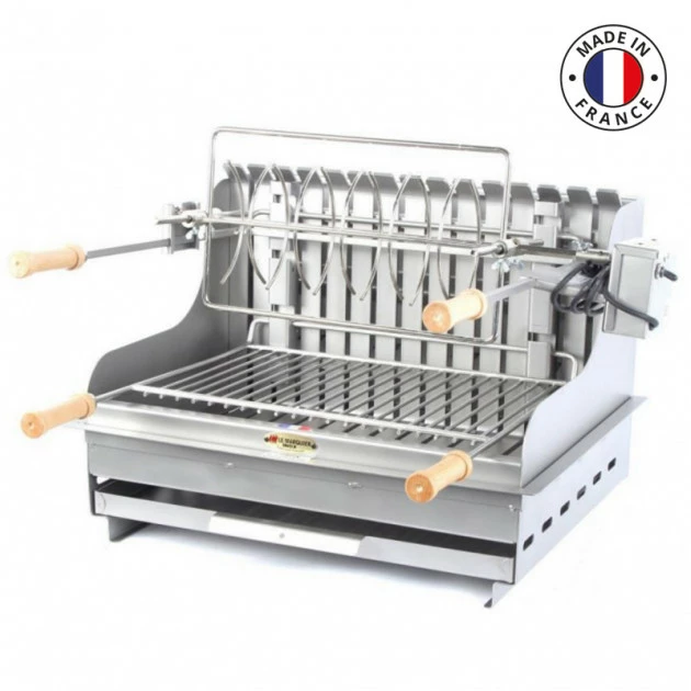 Ce barbecue charbon de bois est fabriqué en France. Ce grill est doté d’une grille de cuisson réglable sur plusieurs niveaux mais également d’un tournebroche, idéal pour varier les modes de cuisson. Ce barbecue charbon de bois a un double foyer, vertical et horizontal, vous offrant de nombreuses possibilités. Ce grill s’encastre dans une cuisine d’extérieur ou un chariot. A découvrir chez Barbecue & Co.