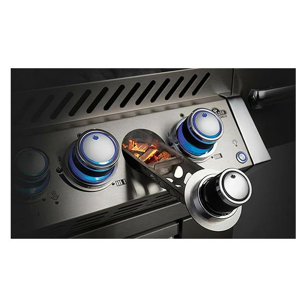 Le barbecue Napoléon Prestige comprend des boutons de commande « Night Light » et dispose de lumières intérieures, permettant ainsi de cuisiner confortablement de nuit.