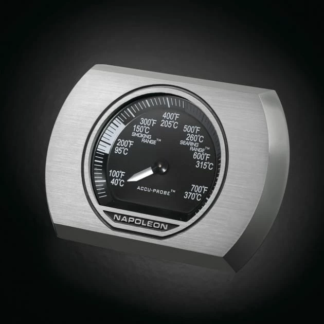 - Thermomètre ACCU PROBE de Napoléon, plus que fiable, est intégré dans le couvercle et indique la température intérieure du gril à gaz.