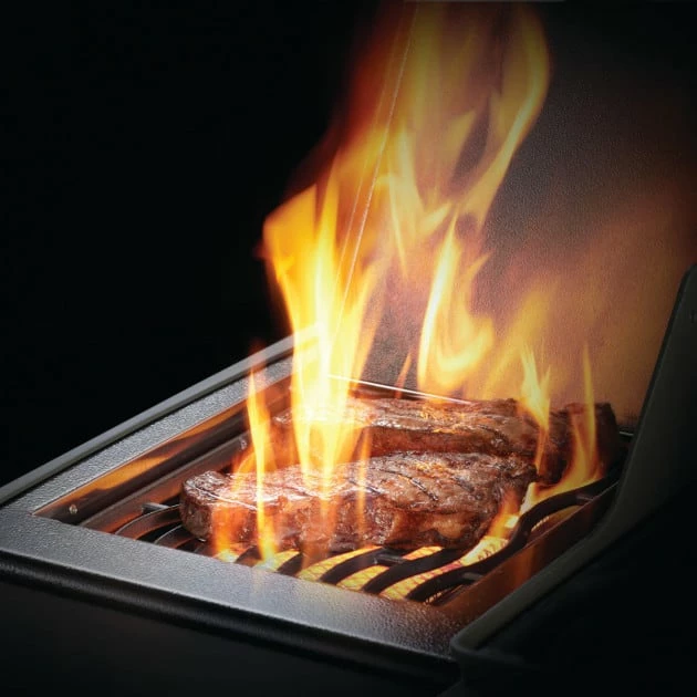 - Brûleur latéral infrarouge SIZZLE ZONE™, petit pour préparer facilement des plats de wok et des steaks grillés avec la marque ultime! La zone de taille infrarouge atteint rapidement une température pouvant atteindre 800°C et garantit des arômes torréfiés uniques.